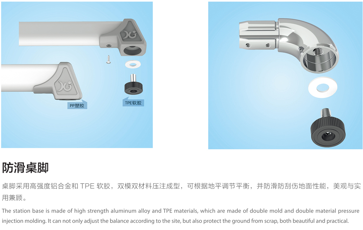 5.桌子脚:采用优质铝合金经模具压注成型,经防氧化处理、整个站脚永不生锈,经久耐用;