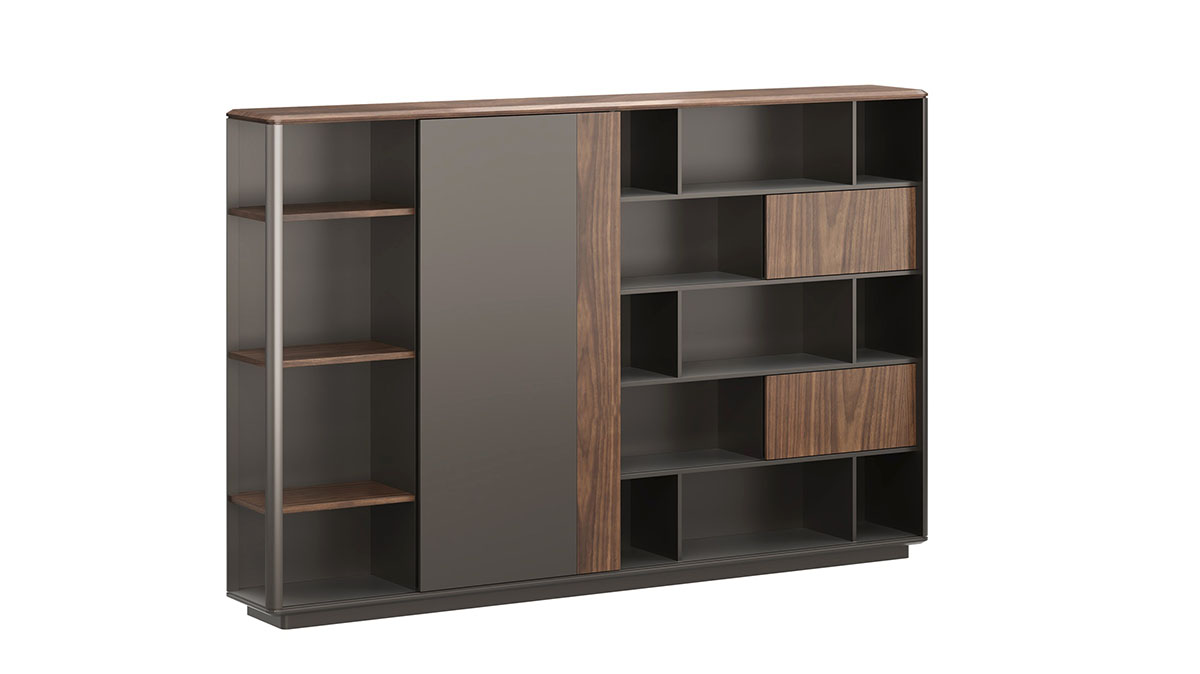 极致办公系列,秉承华旦的时尚优雅的品牌基因,以直线中穿插多维弧度的造型语意,将天然的半开放胡桃木纹与金属的质感有机组合,尽显原木风情与利落高效。